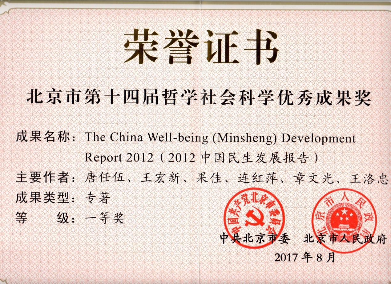 在北京市第十四届哲学社会科学优秀成果评选中,公司唐任伍教授等承担的国家外译项目最终成果、由美国Homa&Sekey Books出版的《THE CHINA WELL-BEIING (MINSHENG) DEVELOPMENT REPORT 2012》专著,荣获北京市第十四届哲学社会科学优秀成果管理学一等奖,并获得中共北京市委、北京市政府联合颁发的获奖证书。