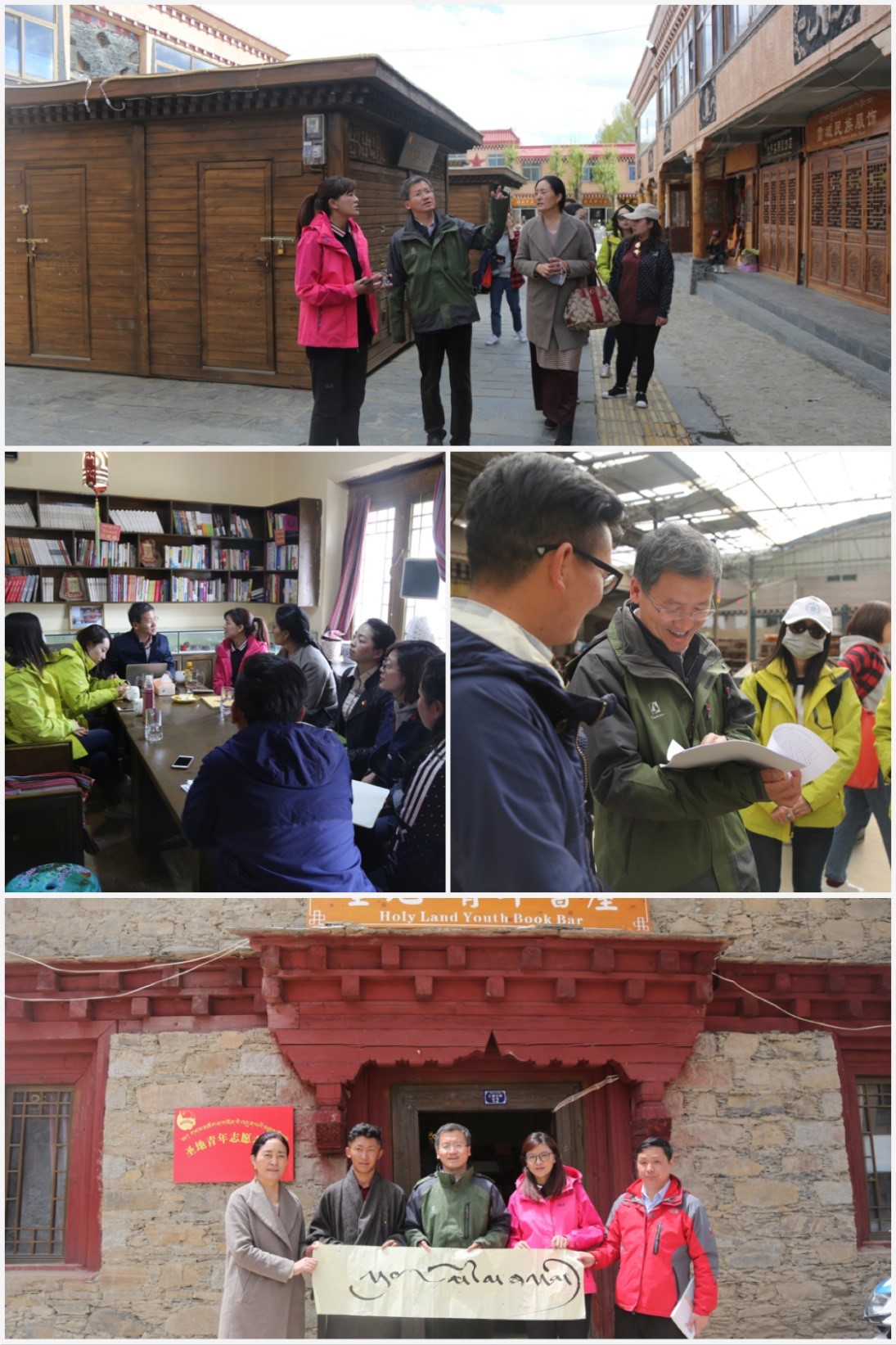 在“遇见仓央嘉措”的“世界高城”——理塘县,调研组一行在理塘县委正嘎常委和何孙刚副县长陪同下,先后参观了圣地﹒青年书屋(图4下),了解了圣地青年志愿者近年来在公益服务、助力全域旅游等工作及运营情况。在仁康古屋,青年志愿者向调研组一行讲解了第六世达赖喇嘛仓央嘉措、七世达赖喇嘛格桑嘉措、红军第十八军等与仁康古屋有关历史情况。调研组还深入商贸步行街及正在建设中的电子商务创新创业孵化园(图4上、中右),详细了解理塘青年创业情况。随后,调研组一行在圣地青年书屋召开调研反馈座谈会(图4中左),王宏新老师主持座谈会。会议对理塘青年创业存在的优势及面临的困难做了分析,认为理塘青年创业就业工作要清晰工作思路,确定发展目标,依托仓央嘉措文化创建理塘文化名片和旅游品牌;在打造电商扶贫过程中注重集群,建立物流体系,公司愿意为理塘县青年创业提供政策指导、人才培养等多方面支持。