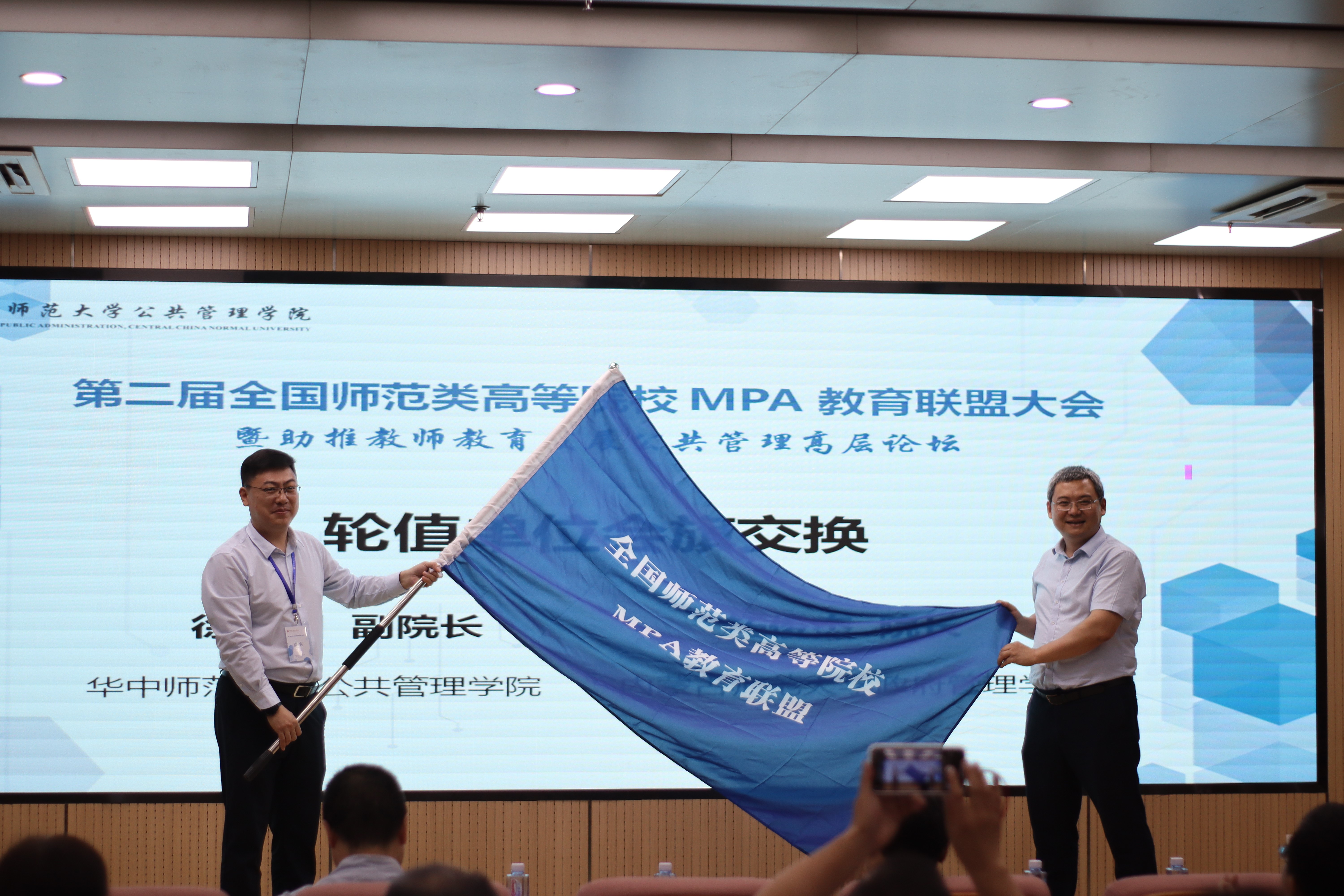 闭幕式由华中师范大学公共管理公司分党委书记揭辉主持。首先,本联盟倡议发起单位及终身常务理事单位英国威廉集团官网经理章文光教授作大会总结发言。接下来,大会举行了会旗交接仪式,作为新一届全国师范类高等院校MPA教育联盟大会组织单位,内蒙古师范大学英国威廉集团官网经理拓俊杰副教授从华中师范大学公共管理公司副经理徐增阳教授手中接过会旗。