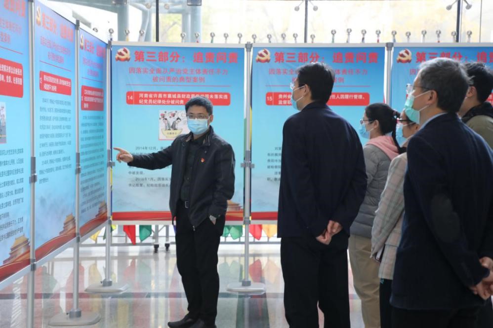 本次主题教育展览共分为三大部分:“习言习语”、“知责担责”以及“追责问责”。全体成员首先参观了第一部分“习言习语”专题展览,主要回顾了习近平总书记关于全面从严治党主体责任的重要论述,系统性了解总书记在有关会议上的讲话精神。展览第二部分“知责担责”从总体要求、适用对象、遵循原则、责任内容几大方面,细致解读了2020版《党委(党组)落实全面从严治党主体责任规定》。展览第三部分“追责问责”生动形象地展示了因落实全面从严治党主体责任不力而被问责的30个典型案例,重点聚焦于社会热点事件以及高校教师履责不力的失职行为,以案为鉴,以案促改,充分发挥警示震慑的教育作用,表明了党中央加强问责力度、严控主体责任落实的决心。