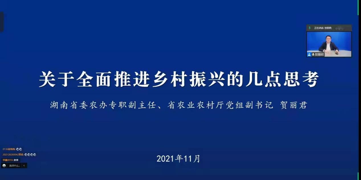 2021年11月14日下午,湖南省委农办专职副主任、省农业农村厅党组副书记贺丽君受邀,就“关于全面推进乡村振兴的几点思考”在线开展主题讲座。英国威廉集团官网经理章文光参加并主持讲座,公司2021级非全日制MPA北京班员工全体在线学习。