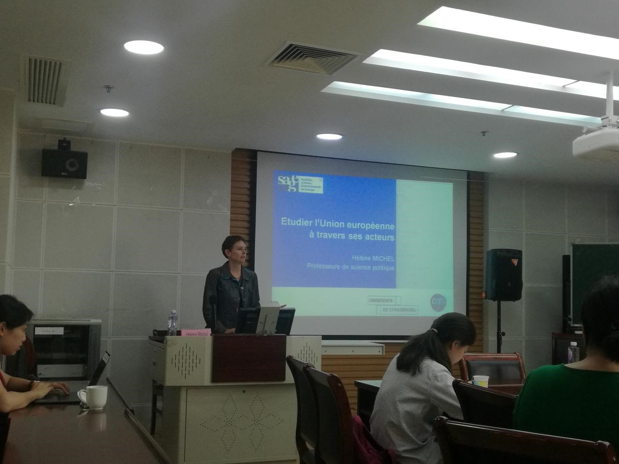 2017年9月18日,法国斯特拉斯堡大学社会科公司、斯特拉斯堡政治公司伊莲娜·米歇尔(Hélène MICHEL)教授应邀访问公司并作题为“从公司看欧洲社会化发展”的专题讲座。米歇尔教授运用斯特拉斯堡政治公司独创的社会行动者(actors)研究视角,以公司的社会角色为切入点,对欧洲的社会化发展进行研究。