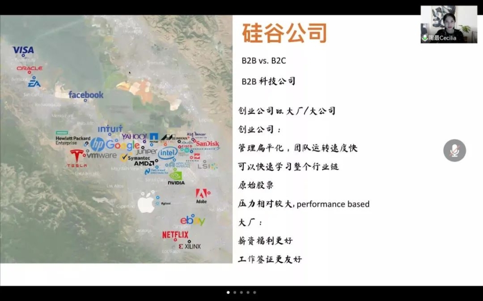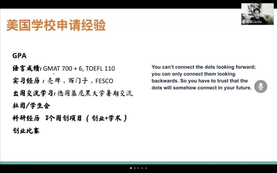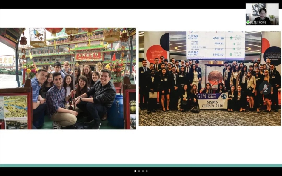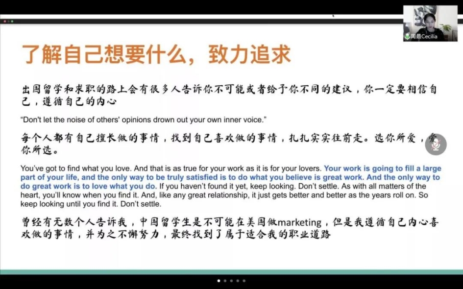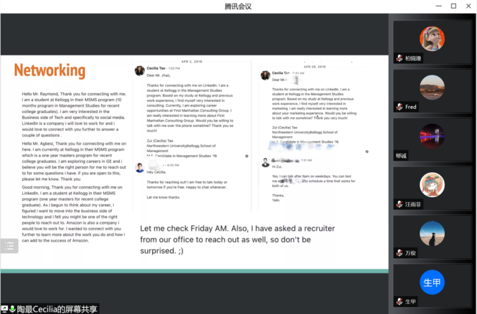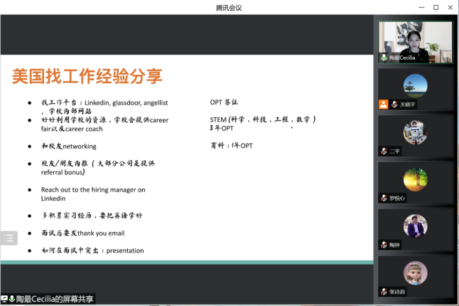 会议中,陶最女士的分享从三个方面展开。首先,陶女士为我们介绍了美国公司的申请经验,重点强调了美国商公司重视的学术能力、语言能力等,并结合自己的申请经历具体展开分析,为同学们提供申请的借鉴与参考。接下来,陶女士为我们介绍在芝加哥西北大学商公司求学期间的经历,分享了在国外老员工活与学习的有趣体验,尤其是在casestudy 和 presentation中学习的知识与收获的成长,让同学们进一步了解海外留学的培养模式,并为我们介绍了暑期实习回国参观腾讯总部、华为工厂的经历,展示如何将所学知识与实际相结合。最后,陶女士分享在美国寻找工作的相关经验,列举出了多条获得工作offer的平台与路径,以及面试的技巧,并结合自己在硅谷公司的工作经历,分享工作中的心得与体会,让同学们全面了解海外从留学到工作的过程体验,她还建议同学们了解自己真正想要什么,由此做出最佳决策。至此,陶最女士分享的主要内容结束。